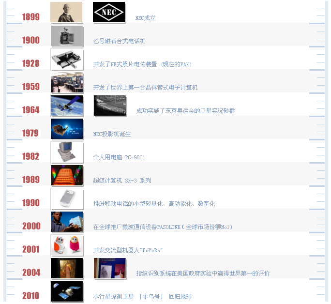 NEC成立于1899年,至今已有110多年的歷史,長(zhǎng)期位列于世界500強(qiáng)名錄之列。NEC是全球IT和通信網(wǎng)絡(luò)的領(lǐng)先供應(yīng)商之一,在超級(jí)計(jì)算機(jī)、光通信、微波、衛(wèi)星通信、移動(dòng)通信、納米技術(shù)、半導(dǎo)體芯片、信息存儲(chǔ)、生物特征識(shí)別、液晶等領(lǐng)域保持著多項(xiàng)世界領(lǐng)先記錄,為政府、行業(yè)、企業(yè)及個(gè)人提供卓越的綜合解決方案。